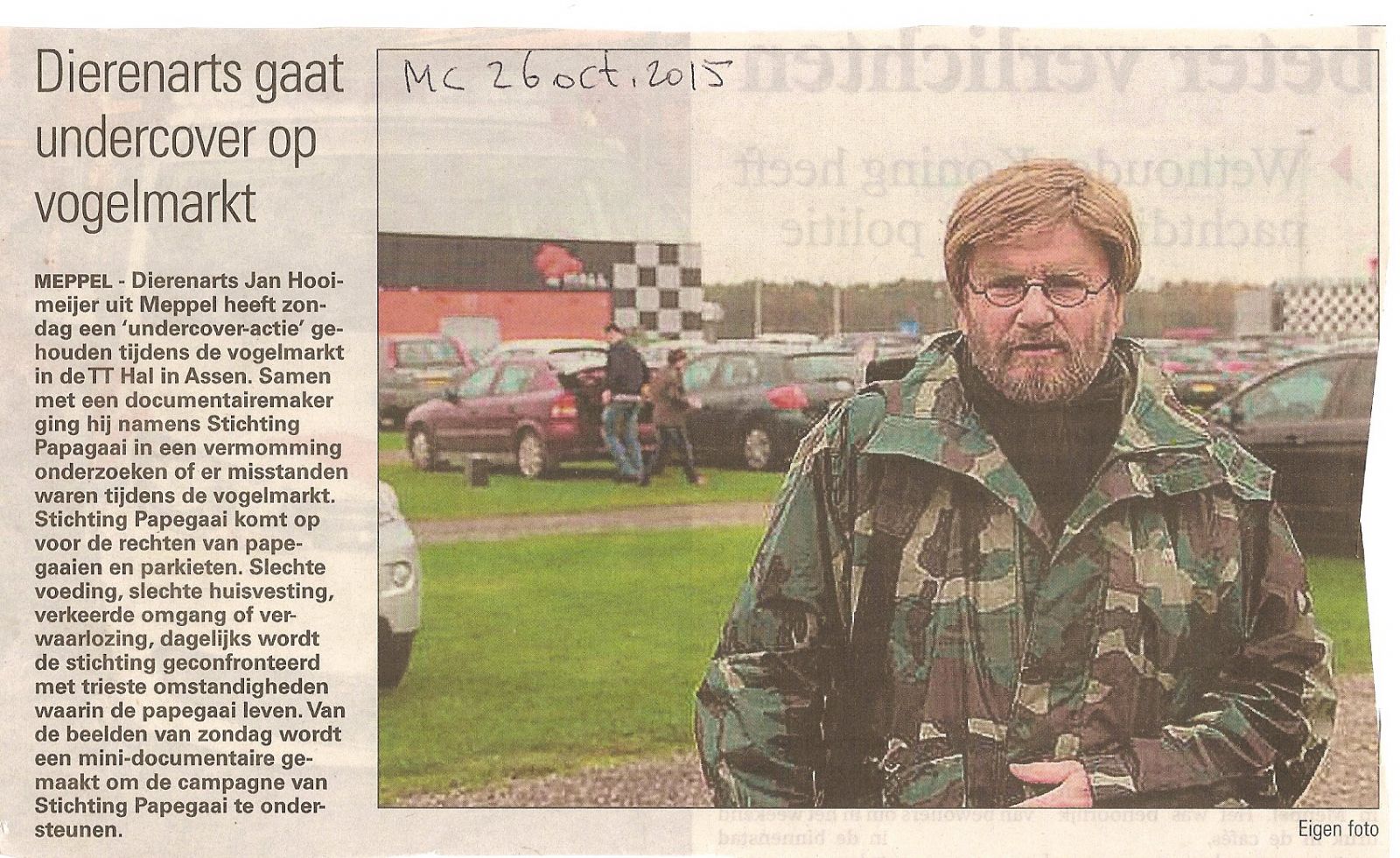 Om onze campagne tegen de vogelmarkten kracht bij te zetten ging onze voorzitter Jan Hooimeijer zaterdag 24 oktober undercover naar de vogelmarkt in de TT Hallen te Assen. Samen met een documentaire maker heeft hij de misstanden welke zich tijdens vogelmarkten voordoen weten vast te leggen. De beelden die zij hierbij gemaakt hebben zullen binnenkort in een mini documentaire te zien zijn.